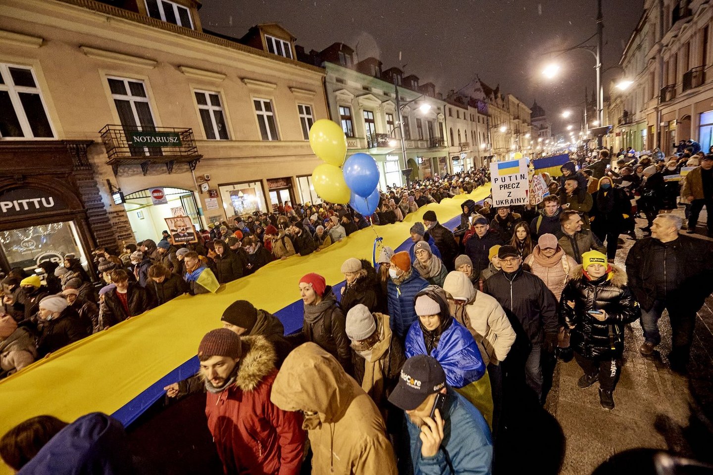 Marsz "Stop Wojnie!" na Piotrkowskiej. Łodzianie nieśli ogromną flagę Ukrainy [ZDJĘCIA, WIDEO]