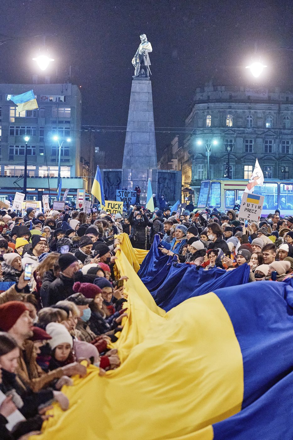 Marsz "Stop Wojnie!" na Piotrkowskiej. Łodzianie nieśli ogromną flagę Ukrainy [ZDJĘCIA, WIDEO]