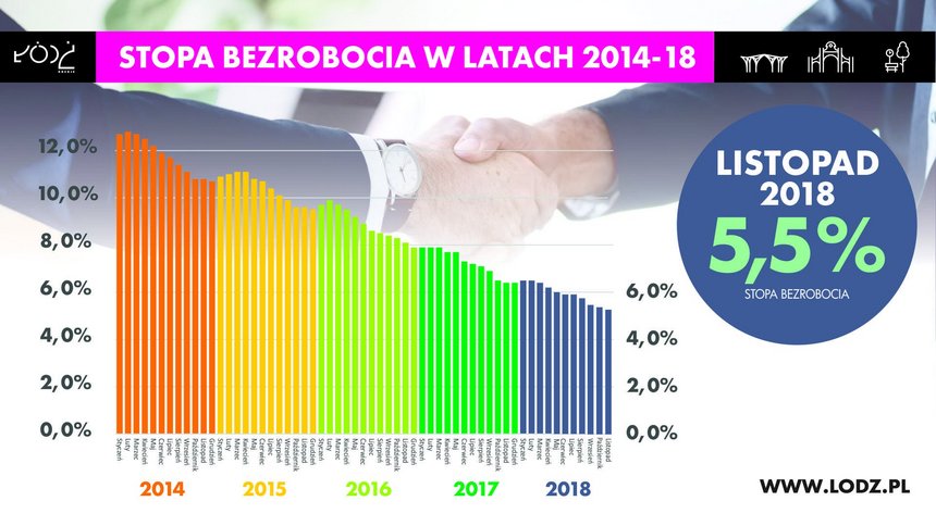 Dobre wiadomości płyną z łódzkiego rynku pracy. Z danych na koniec listopada 2018 r. wynika, że stopa bezrobocia spadła do rekordowo niskiego poziomu 5,5 proc. Dla porównania, pod koniec 2014 r. wynosiła blisko 11 proc. Celem władz Łodzi na koniec 2019 r. jest obniżenie stopy bezrobocia do poziomu poniżej 5 proc.