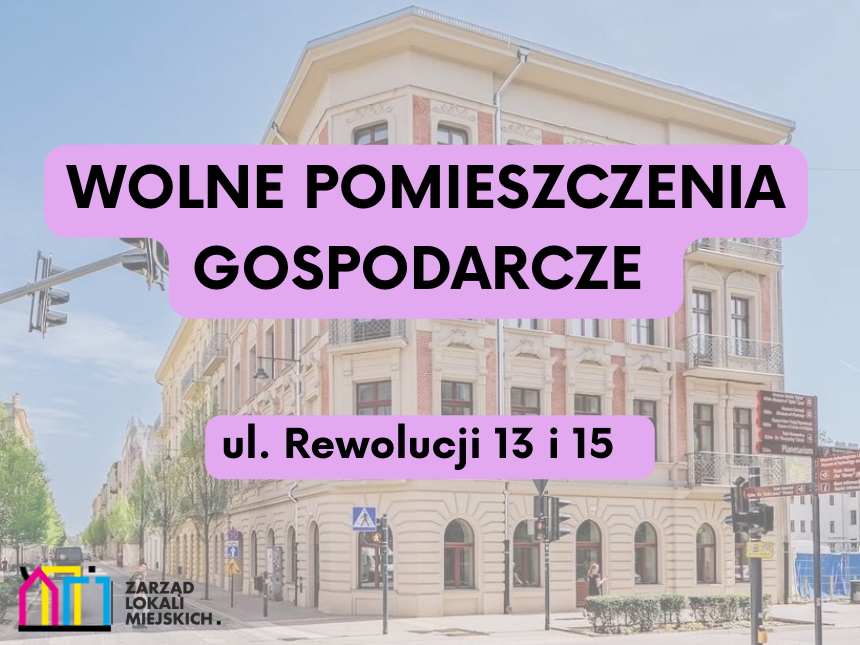 Informujemy, że od poniedziałku (23 lutego 2026 r.) będzie możliwość składania wniosków o wynajęcie wolnych pomieszczeń gospodarczych na terenie nieruchomości przy ul. Rewolucji 1905 roku 13 i 15 w Łodzi.