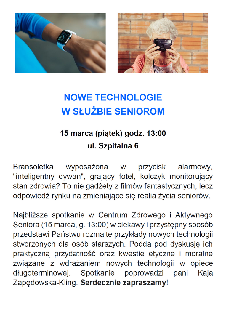 Najbliższe spotkanie w Centrum Zdrowego i Aktywnego Seniora w ciekawy i przystępny sposób przedstawi Państwu rozmaite przykłady nowych technologii stworzonych dla osób starszych. Podda pod dyskusję ich praktyczną przydatność oraz kwestie etyczne i moralne związane z wdrażaniem nowych technologii w opiece długoterminowej.