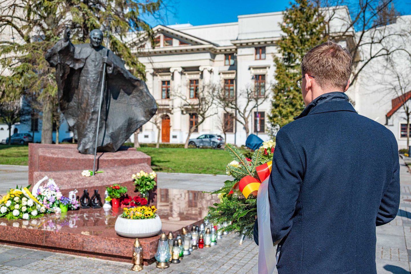 Wiceprezydent Adam Wieczorek składa kwiaty pod pomnikiem papieża w Łodzi. Fot. P. Wacławiak, UMŁ.