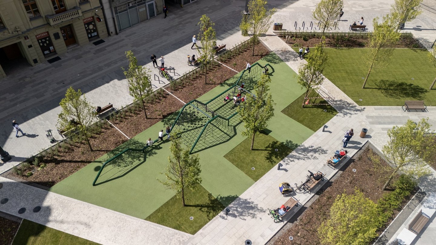 Widok z lotu ptaka na plac zabaw na Placu Wolności