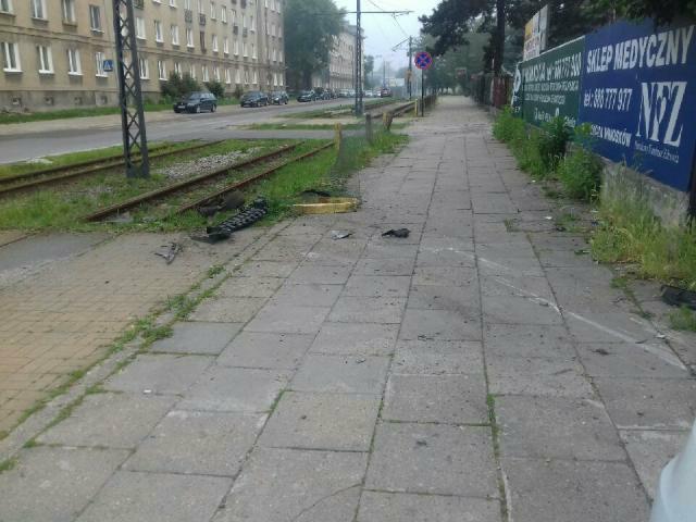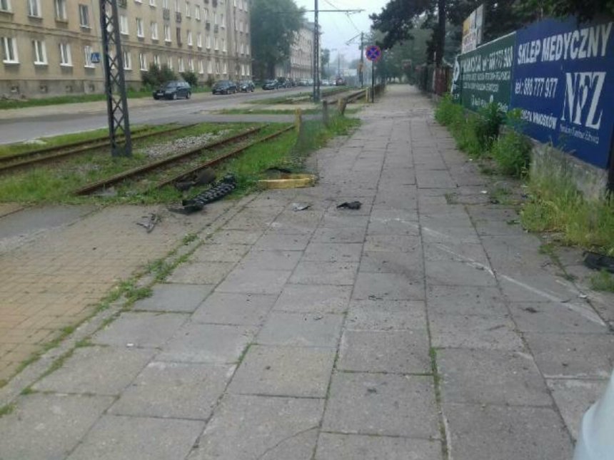 Rozbite słupki i ślad na chodniku od przejazdu auta, fot. arch. SM