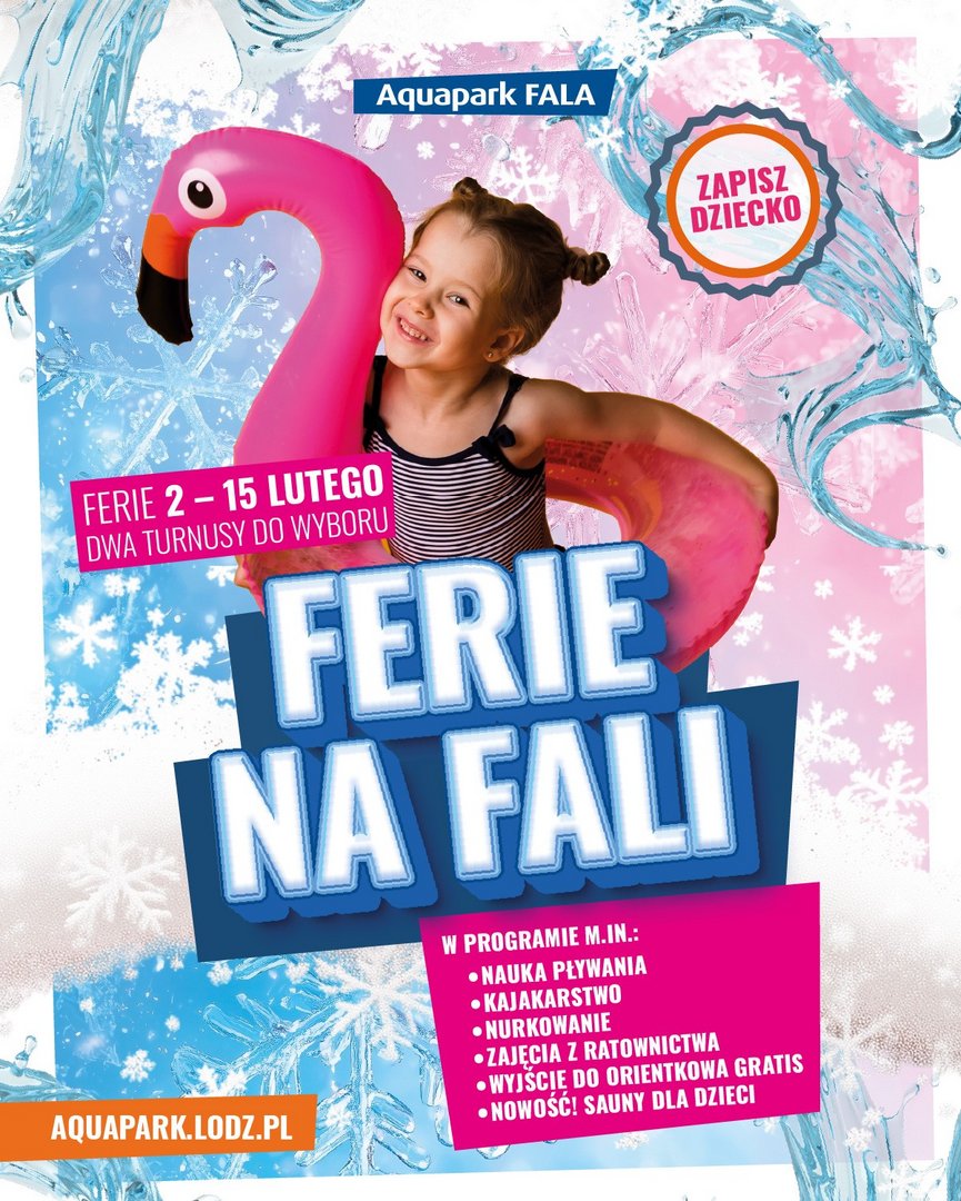 Chociaż do ferii w województwie łódzkim zostało jeszcze trochę czasu (w tym roku szkolnym zaczynają się 2 lutego) już teraz warto zaplanować dzieciom atrakcje i przy okazji skorzystać z niższych cen. W Łodzi nie brakuje opcji, a wśród nich są niezaWODNE ferie organizowane przez Aquapark Fala (al. Unii Lubelskiej 4) we współpracy z Akademią Pływania. Jedno jest pewne – nudy nie będzie!