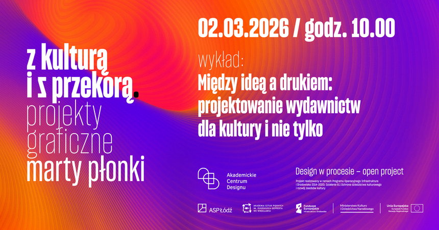 Zapraszamy na wykład dr hab. Marty Płonki, prof. ASP o tytule „Między ideą a drukiem: projektowanie dla wydawnictw kultury i nie tylko”. Rozpocznie się on 2 marca o godz. 10:00 w sali konferencyjnej Akademickiego Centrum Designu. Marta Płonka jest Prorektorką ds. naukowych i współpracy z podmiotami zewnętrznymi Akademii Sztuk Pięknych im. Eugeniusza Gepperta we Wrocławiu, a także autorką dostępnej w ACD wystawy graficznej „Z kulturą i z przekorą”.