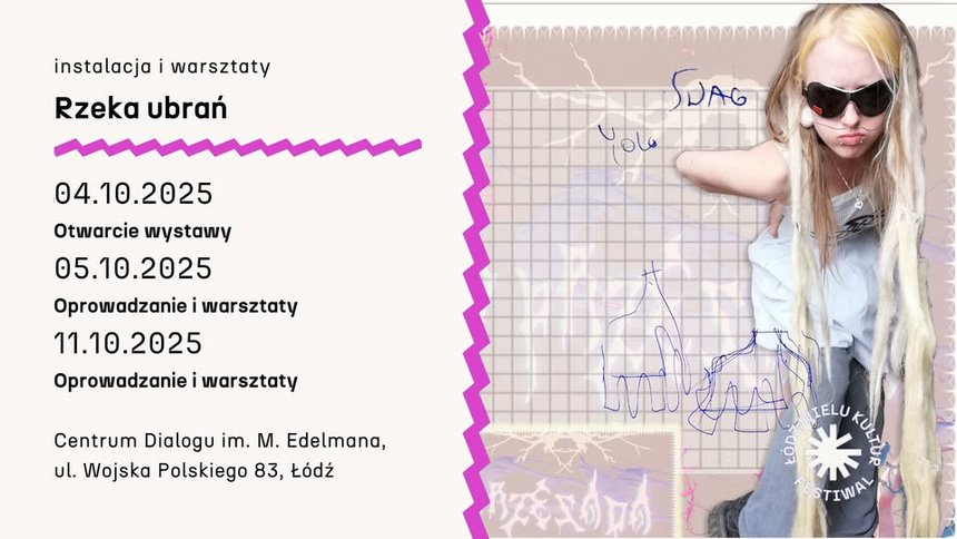 „Rzeka ubrań” to instalacja interaktywna stworzona specjalnie dla Festiwalu Łódź Wielu Kultur 2025. To opowieść o czasach, w których żyjemy, nadprodukcji odzieży, kulturze TikToka, konsumpcji i tożsamości budowanej poprzez styl ubierania. „Rzeka ubrań” to wielkoformatowa forma złożona z ubrań z drugiego obiegu, w którą można wejść, z którą można się zetknąć, a czasem nawet… coś przymierzyć. Wystawie towarzyszą oprowadzania autorskie i warsztaty tekstylne.