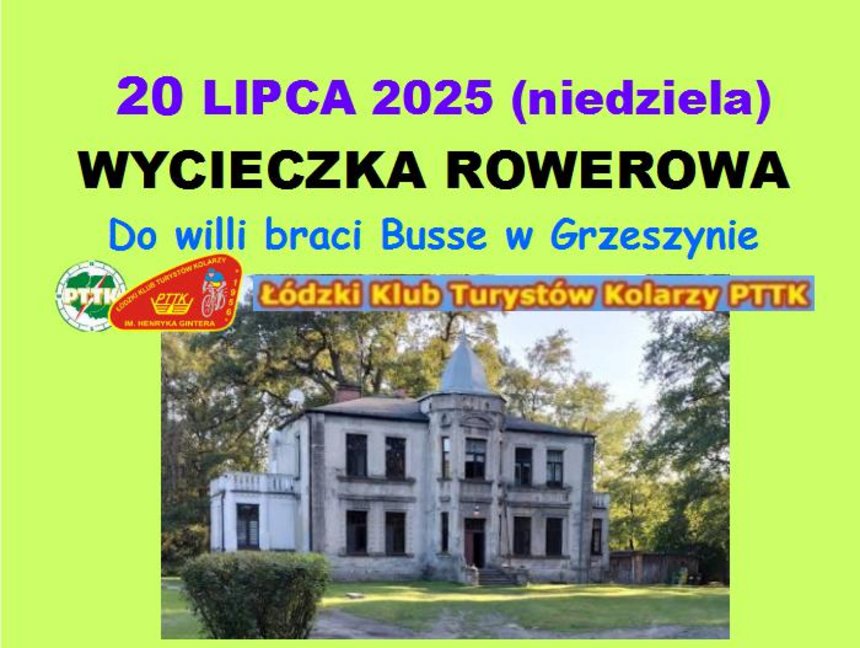 Łódzki Klub Turystów Kolarzy PTTK zaprasza Sympatyków i Klubowiczów na bezpłatną wycieczkę rowerową w dniu 20.07.2025(niedziela) pt."Do willi braci Busse w Grzeszynie".