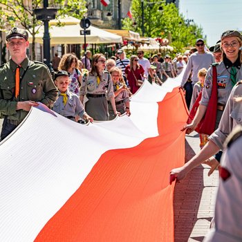Artur Dunin, posłanka Małgorzata Niemczyk i poseł Krzysztof Piątkowski, łódzcy harcerze i Orkiestra MPK. 123-metrowa należy do Chorągwi Łódzkiej ZHP, która od 2018 roku jest organizatorem marszu z okazji więcej
