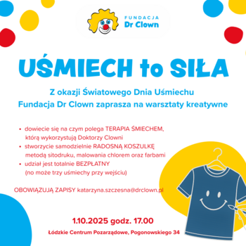 W programie: • integracja i zabawy pełne uśmiechu, • aktywne poznanie terapii śmiechem, • kreatywne warsztaty ozdabiania koszulek metodą sitodruku i malowania chlorem! Uwaga! Każdy uczestnik otrzyma bezpłatnie [...] bawełniana i najlepiej czarna. Kiedy? 1 października 2025 roku, godzina 17:00–19:30 Gdzie? Łódzkie Centrum Pozarządowe, ul. Pogonowskiego 34, Łódź Nie musisz nic przygotowywać – wystarczy otwartość, chęć więcej